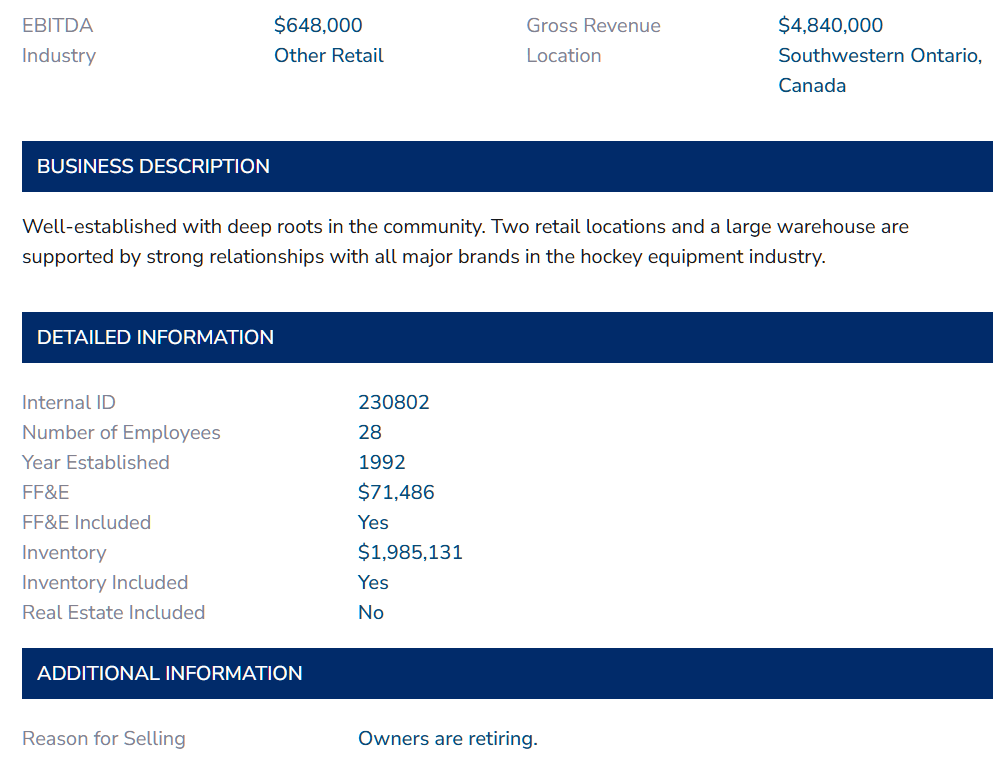Located within Southwestern Ontario, an existing retail footprint, separate warehouse facility, and custom apparel operations provide a profitable starting point for your entry into the business of Hockey. Growth is easy to imagine, with additional locations, an online sales program, or expanding product offerings as your individual interests drive you.